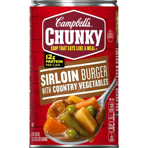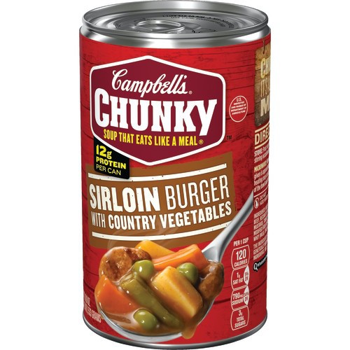 Details Ingredients Ingredients: Water, Carrots, Beef Stock, Potatoes, Seasoned Beef Sirloin Burgers (Sirloin Beef, Reconstituted Onions, Potato Extract, Salt, Monosodium Glutamate, Flavoring, Mustard), Tomato Puree (Water, Tomato Paste), Green Beans, Peas, Contains Less Than 2% Of: Modified Food Starch, Salt, Wheat Flour, Yeast Extract, Caramel Color, Flavoring, Fermented Whey (Milk), Spice, Onion Extract. Show more Product features Campbell's Chunky Sirloin Burger with Country Vegetables Soup features the slow-cooked comfort you crave. Seasoned beef, country vegetables and loads of flavor make this fill-you-up soup a leading contender to tackle your hunger. Hearty soup bursting with flavor from seasoned beef and country vegetables 12 grams of protein per can Expect spoonfuls loaded with big pieces in bold flavors A great choice when you’re hungry and don’t have time to cook Try pouring it over mashed potatoes Special Features The official soup sponsor of the NFL Net Quantity of Content 2.0 X 1 CUP (240mL)