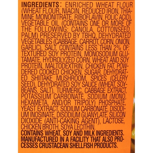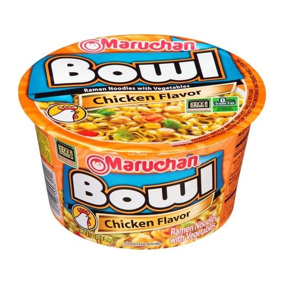 Details Ingredients ENRICHED WHEAT FLOUR (WHEAT FLOUR, NIACIN, REDUCED IRON, THIAMINE MONONITRATE, RIBOFLAVIN, FOLIC ACID), VEGETABLE OIL (CONTAINS ONE OR MORE OF THE FOLLOWING: CANOLA, COTTONSEED, PALM) PRESERVED BY TBHQ, DEHYDRATED VEGETABLES (CABBAGE, CARROT, CORN, ONION, GARLIC), SALT, CONTAINS LESS THAN 2% OF: TEXTURED SOY PROTEIN, MONOSODIUM GLUTAMATE, HYDROLYZED CORN, WHEAT AND SOY PROTEIN, MALTODEXTRIN, CHICKEN FAT, POWDERED COOKED CHICKEN, SUGAR, DEHYDRATED SHIITAKE MUSHROOM, SPICES (CELERY SEED), DEHYDRATED SOY SAUCE (WHEAT, SOY-BEANS, SALT), TURMERIC, CABBAGE EXTRACT, POTASSIUM CARBONATE, SODIUM (MONO, HEXAMETA, AND/OR TRIPOLY) PHOSPHATE, YEAST EXTRACT, SODIUM CARBONATE, DISODIUM INOSINATE, DISODIUM GUANYLATE, SILICON DIOXIDE (ANTI-CAKING AGENT), LACTOSE, CHICKEN BROTH, SOYA LECITHIN. Show more Product features Maruchan Bowls are made with top quality ramen noodles. Satisfying and delicious, the Maruchan Bowl is microwavable and easy to make. Ready in 3 minutes. Ramen Noodles, with Vegetables, Chicken Flavor Microwaveable: 3 minutes. 0 grams trans fat. See nutrition facts for saturated fat and sodium info. www.maruchan.com. Net Quantity of Content 2 X 47.0 g