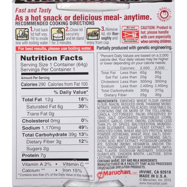 Details Ingredients ENRICHED WHEAT FLOUR (WHEAT FLOUR, NIACIN, REDUCED IRON, THIAMINE MONONITRATE, RIBOFLAVIN, FOLIC ACID), VEGETABLE OIL (CONTAINS ONE OR MORE OF THE FOLLOWING: CANOLA, COTTONSEED, PALM) PRESERVED BY TBHQ, SALT, DEHYDRATED VEGETABLES (CORN, CARROT, GARLIC, CHIVE, ONION), CONTAINS LESS THAN 2% OF: SPICES, MALTODEXTRIN, MONOSODIUM GLUTAMATE, SUGAR, YEAST EXTRACT, HYDROLYZED CORN, WHEAT AND SOY PROTEIN, MISO POWDER (SOYBEANS, WHEAT, RICE, SALT), DEHYDRATED SOY SAUCE (WHEAT, SOYBEANS, SALT), CITRIC ACID, BEEF EXTRACT, POTASSIUM CARBONATE, SODIUM (MONO, HEXAMETA, AND/OR TRI- POLY) PHOSPHATE, SODIUM CARBONATE, NATURAL FLAVOR, DISODIUM INOSINATE, DISODIUM GUANYLATE, CHICKEN BROTH, LACTOSE, SOYA LECITHIN, TURMERIC. Show more Product features These 2.25-oz Maruchan Instant Lunch Noodles can be served as a snack or a delicious meal. They are packaged in a convenient cup and easy to prepare in only three minutes by just adding hot water. These Maruchan ramen noodles with vegetables can be enjoyed anywhere whether camping, hiking, at the office or on a beach. Instant Lunch, Hot & Spicy Beef Flavor Ramen noodles with vegetables. Hot. 3 minute. 0 grams trans fat. Fast and tasty. As a hot snack or delicious meal - anytime. www.maruchan.com. Quality guaranteed. Made in USA. Special Features With vegetables Net Quantity of Content 1 X 64 g