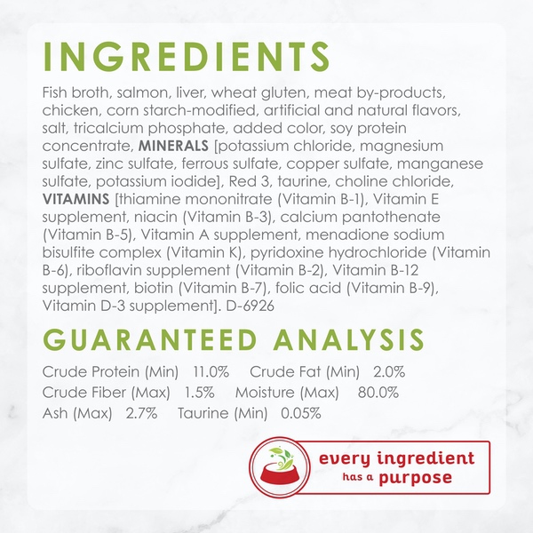 Details Ingredients Fish Broth, Salmon, Liver, Wheat Gluten, Meat By-Products, Chicken, Corn Starch-Modified, Artificial And Natural Flavors, Salt, Tricalcium Phosphate, Added Color, Soy Protein Concentrate, Minerals [Potassium Chloride, Magnesium Sulfate, Zinc Sulfate, Ferrous Sulfate, Copper Sulfate, Manganese Sulfate, Potassium Iodide], Red 3, Taurine, Choline Chloride, Vitamins [Thiamine Mononitrate (Vitamin B-1), Vitamin E Supplement, Niacin (Vitamin B-3), Calcium Pantothenate (Vitamin B-5), Vitamin A Supplement, Menadione Sodium Bisulfite Complex (Vitamin K), Pyridoxine Hydrochloride (Vitamin B-6), Riboflavin Supplement (Vitamin B-2), Vitamin B-12 Supplement, Biotin (Vitamin B-7), Folic Acid (Vitamin B-9), Vitamin D-3 Supplement]. D-6926 Show more Product features Offer your fabulous feline a gourmet meal befitting her place in your heart with Purina Fancy Feast Grilled Salmon Feast in Gravy wet cat food. From the moment she hears the can opener, she'll be at your feet for the delicious feast of grilled salmon in a savory gravy. This premium wet cat food provides 100% complete and balanced nutrition in a sophisticated blend made for her tastes. The culinary catch features tender chunks of slow-grilled salmon that she can sink her teeth into, and the light gravy adds just a touch of delicious background for a great taste cats love. With essential vitamins and minerals to help support her whole-body health, this Fancy Feast cat food recipe lets you give her good food in a pleasing presentation. Serve her Purina Fancy Feast Grilled Salmon Feast in Gravy with a sprig or two of cat grass for a truly fancy feast. You know the meaning of true value and a quality product, so give your cat the taste and quality she deserves when you order Fancy Feast. Tender grilled chunks of salmon provide texture 100% complete and balanced nutrition for cats Light delicious gravy that cats love Essential vitamins and minerals help support her overall health Slow-grilled delicious salmon flavor Special Features In gravy