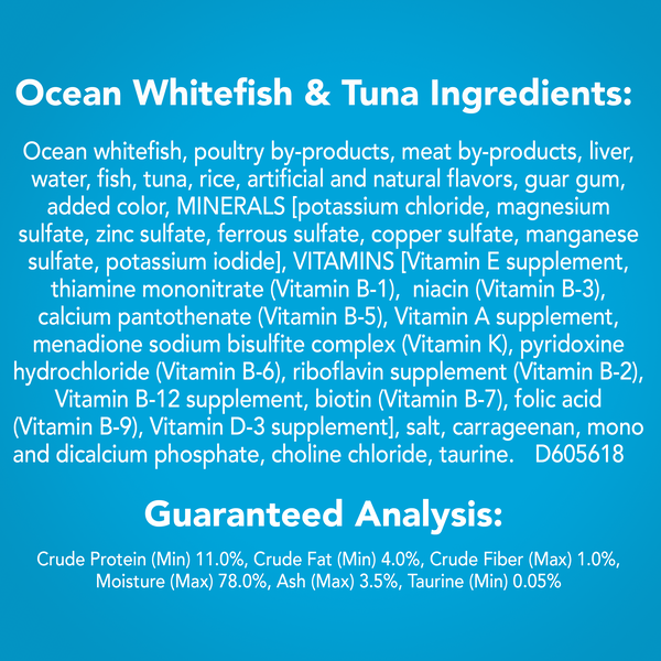 Details Ingredients Ocean whitefish, poultry by-products, meat by-products, liver, water, fish, tuna, rice, artificial and natural flavors, guar gum, added color, MINERALS [potassium chloride, magnesium sulfate, zinc sulfate, ferrous sulfate, copper sulfate, manganese sulfate, potassium iodide], VITAMINS [Vitamin E supplement, thiamine mononitrate (Vitamin B-1), niacin (Vitamin B-3), calcium pantothenate (Vitamin B-5), Vitamin A supplement, menadione sodium bisulfite complex (Vitamin K), pyridoxine hydrochloride (Vitamin B-6), riboflavin supplement (Vitamin B-2), Vitamin B-12 supplement, biotin (Vitamin B-7), folic acid (Vitamin B-9), Vitamin D-3 supplement], salt, carrageenan, mono and dicalcium phosphate, choline chloride, taurine. D605618 Show more Product features Satisfy your cat's cravings for tasty fish flavor with Purina Friskies Pate Ocean Whitefish & Tuna Dinner wet cat food. The mix of ocean whitefish and tuna delivers rich seafood flavor to her dish, and the smooth pate invites her to nibble away at the delectable goodness found in every serving. An enticing aroma leads your cat to her dish every time you fill it, letting her know something delicious is on the way. Packaged in a convenient 13-ounce can, this wet cat food is ideal for multi-cat households, ensuring all your feline family members get the taste they love at mealtime. With 100% complete and balanced nutrition for adult cats and kittens, this recipe follows your cat through every stage of life. Let her belly up to her bowl and indulge in the yummy tastes that make this wet cat food a tempting meal option, and show your cat companion just how much she is loved and adored. You know that quality and value are important. When you order Purina Friskies, you get them both. Ocean and whitefish flavors for the taste cats love Smooth pate texture to please her palate 100% complete and balanced nutrition for kittens and adult cats Contains essential vitamins and minerals Convenient 13-ounce can is ideal for multi-cat households Special Features Classic pate