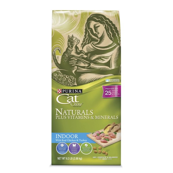 Details Ingredients Chicken By-Product Meal, Corn Gluten Meal, Soy Flour, Brewers Rice, Animal Fat Preserved With Mixed-Tocopherols, Corn Meal, Chicken, Turkey, Powdered Cellulose, Natural Flavor, Soybean Hulls, Phosphoric Acid, Calcium Carbonate, Salt, Dried Spinach, Choline Chloride, Taurine, Vitamin E Supplement, Dl-Methionine, Zinc Sulfate, Ferrous Sulfate, Manganese Sulfate, Potassium Chloride, Niacin, Vitamin A Supplement, Calcium Pantothenate, Thiamine Mononitrate, Copper Sulfate, Riboflavin Supplement, Vitamin B-12 Supplement, Pyridoxine Hydrochloride, Folic Acid, Vitamin D-3 Supplement, Calcium Iodate, Biotin, Menadione Sodium Bisulfite Complex (Source Of Vitamin K Activity), Sodium Selenite. C-4505. Show more Product features When you serve Purina Cat Chow Naturals Indoor Plus Vitamins & Minerals adult dry cat food to your indoor cat, you provide her with a delicious mealtime option packed with natural nutrition designed to meet her unique needs. This indoor cat food recipe features real chicken and turkey, and it's made without added artificial flavors or preservatives, giving you added peace of mind every time you fill her dish. Natural fiber in every serving helps to control hairballs, and the special formulation helps promote her healthy weight. Watch as she comes running when she hears the sound of the kibble hitting her dish, and rest easy knowing she's getting an indoor dry cat food that contains all 25 essential vitamins and minerals. Experience savings beyond just cost when you rely on Walmart.com's convenience and Purina's quality in products like this Purina Cat Chow Naturals adult dry cat food. Made with real chicken and turkey Made without added artificial flavors or preservatives Features a natural fiber blend to help control hairballs Special formulation helps promote your cat's healthy weight Contains all 25 essential vitamins and minerals