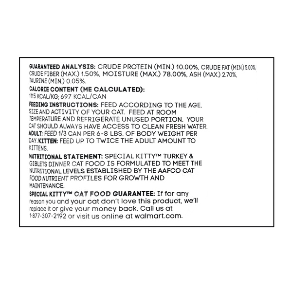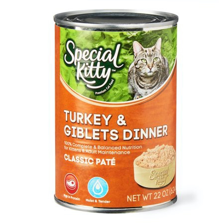 Details Ingredients MEAT BYPRODUCTS, POULTRY BY-PRODUCTS, SUFFICIENT WATER FOR PROCESSING, TURKEY, POULTRY GIBLETS, FISH, EGG PRODUCT, GUAR GUM, ADDED COLOR, CARRAGEENAN, SALT, POTASSIUM CHLORIDE, SODIUM TRIPOLYPHOSPHATE, VITAMINS (VITAMIN E SUPPLEMENT, THIAMINE MONONITRATE, NIACIN SUPPLEMENT, d-CALCIUM PANTOTHENATE, PYRIDOXINE HYDROCHLORIDE, RIBOFLAVIN SUPPLEMENT, VITAMIN A SUPPLEMENT, BIOTIN, VITAMIN D3 SUPPLEMENT, VITAMIN B12 SUPPLEMENT, FOLIC ACID), MINERALS (FERROUS SULFATE, ZINC OXIDE, COPPER PROTEINATE, POTASSIUM IODIDE, MANGANESE SULFATE, SODIUM SELENITE), CHOLINE CHLORIDE, TAURINE. Show more Product features Wake up and serve up a can of Special Kitty Turkey and Giblets Dinner, Classic Pate to your special kitty. Made with 100% complete and balanced nutrition for growth and adult maintenance, this high-protein pate is the choice that will have your cat asking for more. The moist and tender texture of this wet food makes it easy and satisfying for your cat to eat. This blend helps keep your cat hydrated on top of their regular water-drinking habits. When your cat has decided it’s time to eat, simply pull back the tab on the easy-to-open lid. Follow the feeding instructions to serve up the proper amount of food to your cat, and let them chow down as they enjoy as they enjoy the meaty flavor delivered by the turkey and giblets. For a great way to start your cat’s day, open up a can of the Special Kitty Turkey and Giblets Dinner, Classic Pate. Special Kitty Turkey and Giblets Dinner, Classic Pate, 22 oz: Moist and tender pate High in protein Meaty turkey and giblets flavor Pull-tab-lid can allows for easy opening Helps keep your cat hydrated 100% complete and balanced nutrition for growth and adult maintenance