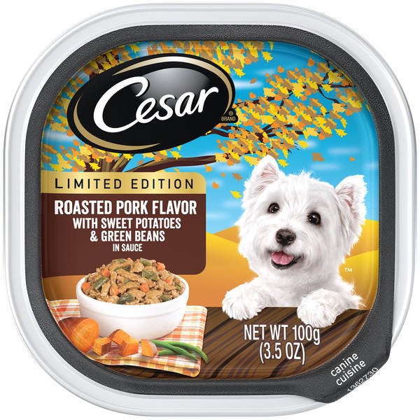 Details Ingredients Sufficient Water For Processing, Chicken, Chicken Liver, Dried Potatoes, Wheat Gluten, Animal Plasma, Corn Starch, Wheat Flour, Pea Fiber, Natural Flavor, Salt, Potassium Chloride, Added Color, Calcium Carbonate, Sodium Tripolyphosphate, Choline Chloride, Magnesium Proteinate, Zinc Sulfate, Xanthan Gum, Natural Glazed Ham Flavor, Guar Gum, Vitamin E Supplement, Biotin, D-Calcium Pantothenate, Copper Sulfate, Thiamine Mononitrate (Vitamin B1), Vitamin B12 Supplement, Riboflavin (Vitamin B2), Potassium Iodide, Vitamin A Supplement, Pyridoxine Hydrochloride, Vitamin D3 Supplement. Show more Product features Dogs love to celebrate the seasons too! Now your dog can enjoy each season with special Limited Edition flavors that are sure to delight even the fussiest eater. CESAR Limited Edition Wet Dog Food give dogs the nutrition they need in the delightful flavors they crave throughout every season. Served in convenient trays with no-fuss, peel-away freshness seals, the CESAR Brand makes mealtime easy. Best of all, our gourmet wet dog food uses ingredients formulated to meet nutritional levels established by the AAFCO dog food nutrient profiles for maintenance. Itâs time to celebrate the season with your dog! Contains one (1) 3.5-oz. tray of CESAR Limited Edition Roasted Pork Flavor with Sweet Potatoes and Green Beans in Sauce Wet Dog Food CESAR LIMITED EDITION flavors are specially developed for your pup to enjoy the passing seasons Make meal time easy, while providing complete and balanced nutrition for adult dogs in one delicious meal Fortified with vitamins and minerals to help dogs of all sizes, especially small breeds, stay healthy Formulated to meet nutritional levels established by the AAFCO dog food nutrient profiles for maintenance