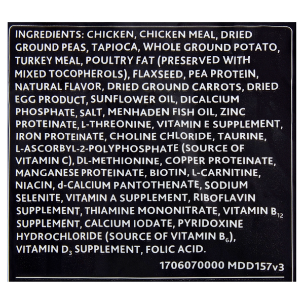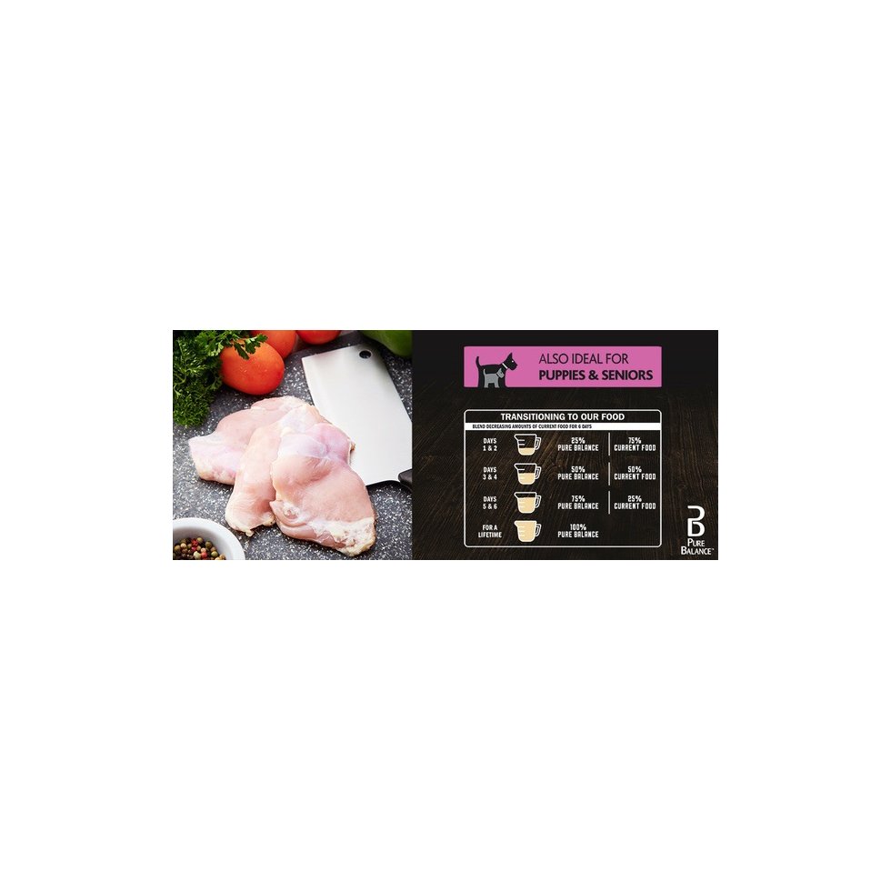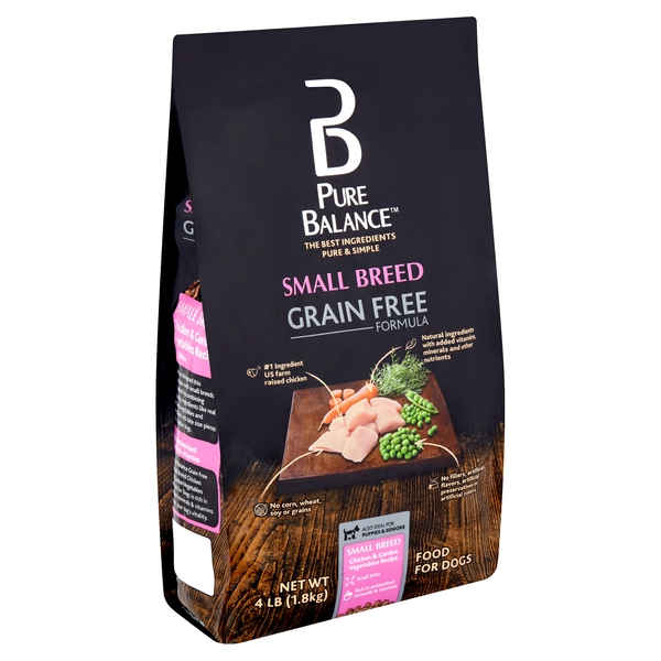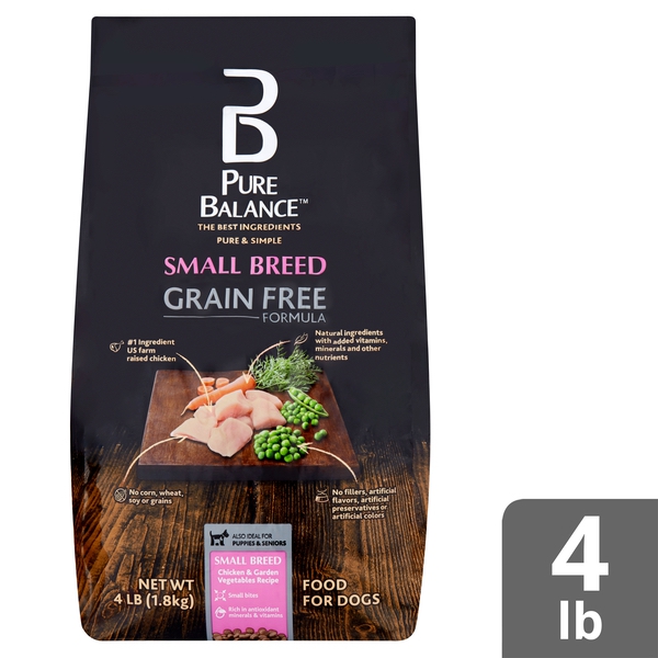 Details Ingredients Chicken, Chicken Meal, Dried Ground Peas, Tapioca, Whole Ground Potato, Turkey Meal, Poultry Fat (Preserved with mixed tocopherols), Flaxseed, Pea Protein, Natural Flavor, Dried Ground Carrots, Dried Egg Powder, Sunflower Oil, Dicalcium Phosphate, Salt, Menhaden Fish Oil, Zinc Proteinate, L-Threonine, Vitamin E Supplement, Iron Proteinate, Choline Chloride, Taurine, L-Ascorbyl-2-Polyphosphate (source of Vitamin C), DL-Methionine, Copper Proteinate, Manganese Proteinate, Biotin, L- Carnitine, Niacin, d-Calcium Pantothenate, Sodium Selenite, Vitamin A Supplement, Riboflavin Supplement, Thiamine Mononitrate, Vitamin B12 Supplement, Calcium Iodate, Pyridoxine Hydrochloride (source of Vitamin B6), Vitamin D3 Supplement, Folic Acid Show more Product features At Pure Balance, we believe in one pure and simple thought - the best nutrition for your dog starts with the best ingredients. That's why Grain Free Small Breed Chicken & Garden Vegetables Recipe contains no corn, wheat or soy or any grains and is made with carefully selected ingredients to ensure your dog gets all the nutrition he needs without any of the extra stuff he doesn't. The first ingredient is chicken, which helps build lean muscle mass in your dog so he can run, jump and play. Our best goes into the foods we make. It's the Pure Balance way and our promise to you and your dog.Treat your dog to the nutritious benefits and flavor of Pure Balance Grain-Free Small Breed Chicken and Garden Vegetables Recipe. At Pure Balance, we believe in one idea - the best nutrition for your pet starts with ingredients you can trust. Each of our super premium recipes are made with natural ingredients with added vitamins, minerals and other nutrients to ensure your pet gets the nutrition they need. Our finest goes into the foods we make and are made with the best quality ingredients from around the world. It's the Pure Balance way. Pure and Simple. Pure Balance Grain-Free Small Breed Chicken & Garden Vegetables Dry Dog Food, 4 Lb: Chicken is the first ingredient No Corn, Wheat or Soy Recipe Natural ingredients with added vitamins & minerals No artificial flavors, artificial preservatives or artificial colors Special Features Grain free formula