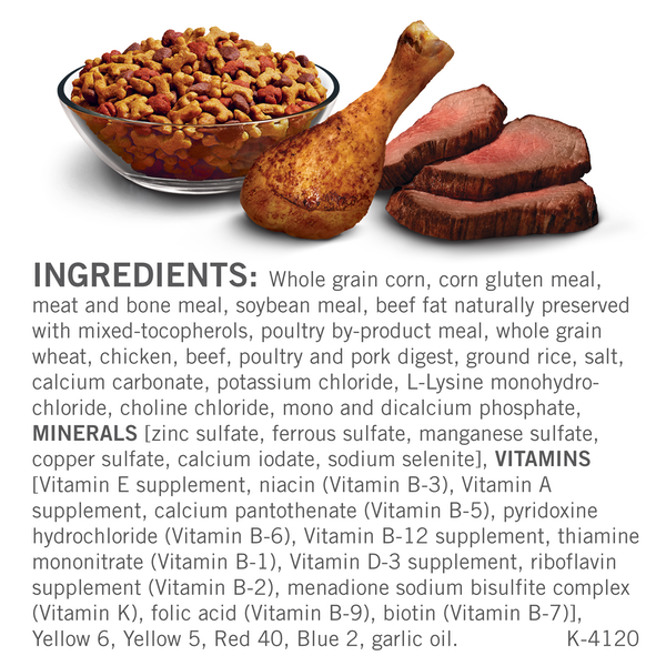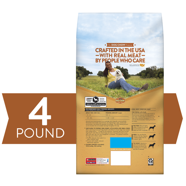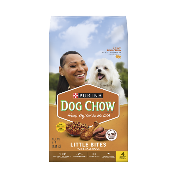 Details Ingredients Whole Grain Corn, Corn Gluten Meal, Meat And Bone Meal, Soybean Meal, Beef Fat Naturally Preserved With Mixed-Tocopherols, Poultry By-Product Meal, Whole Grain Wheat, Chicken, Beef, Poultry And Pork Digest, Ground Rice, Salt, Calcium Carbonate, Potassium Chloride, L-Lysine Monohydrochloride, Choline Chloride, Mono And Dicalcium Phosphate, Minerals [Zinc Sulfate, Ferrous Sulfate, Manganese Sulfate, Copper Sulfate, Calcium Iodate, Sodium Selenite], Vitamins [Vitamin E Supplement, Niacin (Vitamin B-3), Vitamin A Supplement, Calcium Pantothenate (Vitamin B-5), Pyridoxine Hydrochloride (Vitamin B-6), Vitamin B-12 Supplement, Thiamine Mononitrate (Vitamin B-1), Vitamin D-3 Supplement, Riboflavin Supplement (Vitamin B-2), Menadione Sodium Bisulfite Complex (Vitamin K), Folic Acid (Vitamin B-9), Biotin (Vitamin B-7)], Yellow 6, Yellow 5, Red 40, Blue 2, Garlic Oil. K-4120. Show more Product features Take care of your little dog's big appetite by serving him Purina Dog Chow Little Bites Real Chicken & Beef adult dry dog food. If your small dog is between 3 and 20 pounds, regular meals of this delicious crunchy kibble mix can provide the high-quality, specialized nutrition he needs. Formulated for small dogs' higher metabolism, this dry adult dog food supports your little buddy's overall health throughout what is commonly a longer life expectancy than larger-sized dogs. Made with real chicken, beef and other high-quality ingredients, every bowl of this hearty daily staple is protein-packed for strong muscles and the active lifestyle you two enjoy together. Not only does Purina Dog Chow Little Bites Real Chicken & Beef adult dry dog food provide essential nutrition you can depend on, but it also has a taste small dogs love. When you put your list together, add Purina Dog Chow Little Bites dry dog food to give your canine companion the quality tastes he craves. Made with real chicken and beef to help meet your dog's protein needs Protein-packed for strong muscles Antioxidant blend supports the immune system Crunchy kibble blend helps clean teeth Formulated to be 100% complete and balanced for adult small dogs Special Features Big nutrition And taste