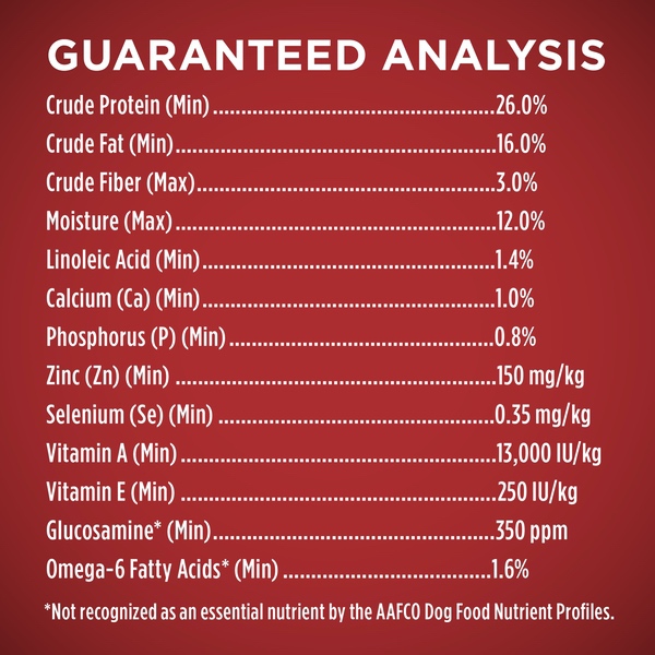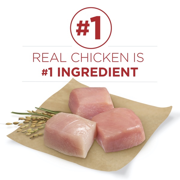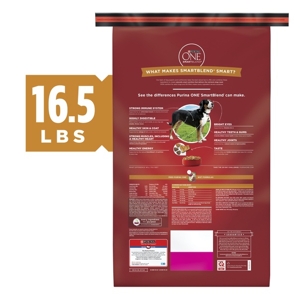 Details Ingredients Chicken (Source Of Glucosamine), Rice Flour, Corn Gluten Meal, Whole Grain Corn, Chicken By-Product Meal (Source Of Glucosamine), Whole Grain Wheat, Soybean Meal, Beef Fat Naturally Preserved With Mixed-Tocopherols, Glycerin, Liver Flavor, Calcium Carbonate, Mono And Dicalcium Phosphate, Salt, Caramel Color, Dried Carrots, Dried Peas, Potassium Chloride, Vitamins [Vitamin E Supplement, Niacin (Vitamin B-3), Vitamin A Supplement, Calcium Pantothenate (Vitamin B-5), Thiamine Mononitrate (Vitamin B-1), Vitamin B-12 Supplement, Riboflavin Supplement (Vitamin B-2), Pyridoxine Hydrochloride (Vitamin B-6), Folic Acid (Vitamin B-9), Menadione Sodium Bisulfite Complex (Vitamin K), Vitamin D-3 Supplement, Biotin (Vitamin B-7)], Minerals [Zinc Sulfate, Ferrous Sulfate, Manganese Sulfate, Copper Sulfate, Calcium Iodate, Sodium Selenite], Choline Chloride, L-Lysine Monohydrochloride, Sulfur. X-4154. Show more Product features Give your dog a delicious meal inspired by the science of nature when you serve Purina ONE SmartBlend Natural Chicken & Rice Formula adult dry dog food. Real chicken is the #1 ingredient in this recipe, and it's blended with other high-quality protein sources to help support your dog's strong muscles and a healthy heart. The combination of protein-rich, tender, meaty morsels and crunchy kibble delivers a tempting texture your dog can't resist, and a pet food formula made with 0% fillers means that every ingredient in this dry dog food has a purpose. With its highly-digestible formula, this wholesome recipe ensures more nutrition goes to work inside your dog, and natural sources of glucosamine help to support healthy joints. Rest easy knowing he's getting 100% complete and balanced nutrition to support his lifelong whole-body health, and watch as he delights in every bite. Make the fast, easy and smart decision by choosing Walmart.com and Purina ONE SmartBlend dog food. Real chicken is the #1 ingredient Dual-defense antioxidant blend to help support a strong immune system Natural sources of glucosamine help to support healthy joints Protein-rich, tender, meaty morsels and crunchy kibble for a taste dogs love High protein helps to support strong muscles Special Features Real chicken is No. 1 ingredient. With protein-rich tender meaty morsels. Antioxidant blend. Glucosamine. Omega-6. Inspired by a deeper understanding of dogs. Vitamin A. Protein. Calcium. Fiber. Vitamin E. What Makes SmartBlend Smart? It's inspired by a deeper understanding of dogs. An understanding that comes from our passion to explore possibilities in nutrition, and our desire to turn them into positive differences in your dog's life. See the differences Purina One SmartBlend can make. Muscles Including Heart: Real chicken, the No. 1 ingredient, and other high-quality protein sources help support strong muscles, including a healthy heart. Digestibility: Highly digestible so more nutrition goes to work inside your dog, which means you may notice smaller, firmer stools. Skin & Coat: Omega-6 fatty acids, vitamins and minerals help give your dog a radiant coat and healthy skin. Immune System: A dual-defense antioxidant blend of vitamins E & A and minerals zinc & selenium help support your dog's strong immune system inside, while promoting healthy skin, his first line of defense on the outside. Bright Eyes: Vitamins E & A help promote bright eyes, a window to your dog's health. Energy: Look for a positive change in your dog's energy, thanks to the high-quality nutrition of Purina One. Dental Health: Crunchy kibble helps keep teeth clean and gums healthy. Joints: A natural source of glucosamine helps support healthy joints. Taste: A combination of tender morsels and crunchy bites helps ensure he eats every bite for the complete and balanced adult nutrition he needs. See the Difference. Share Your Story: We at Purina have highly-regarded dog experts and nutritionists carefully formulate products that can have a positive impact on your dog. Whether it's bright eyes, a radiant coat or even an empty bowl that means your dog is enjoying every bite. Did you see a difference in your dog? Share it at www.PurinaONE.com. Animal feeding tests using AAFCO procedures substantiate that Purina One SmartBlend Chicken & Rice Formula provides complete and balanced nutrition for all life stages of dogs. Calorie Content (Fed): 3993 kcal/kg; 383 kcal/cup. Your pet, our passion. At Purina, we're unconditionally devoted to pets. We've dedicated over 80 years to developing the high-quality products that satisfy the needs of dogs and cats. To find out how we can help you provide a long, happy and healthy life for your pet, ask Purina at Purina.com. Questions or comments? Visit us online at Purina.com or call 1-888-PURINA1 (1-866-787-4621) Monday - Friday, 7 am. to 7 pm, CT. Twitter: Twitter (at)Purina. Facebook: facebook.com/Purina. Contains no added fillers or artificial flavors. See the Difference Guaranteed: We're so sure you'll see a healthy difference in your dog, we're offering a money-back guarantee. If this product has not met your expectations, we will gladly refund your purchase price. Cut out the best if used by date box and weight circle from this bag. Send within 60 days of date on receipt along with your original purchase receipt with the price circled, a brief explanation of why you were dissatisfied with the product, and your name and street address (PO Box not accepted) to: Satisfaction Guarantee, PO Box 1326, Wilkes Barre, PA 18703. Offer good only in USA, APOs and FPOs. Questions? If you have any questions about Purina One and the healthy difference it can make in your pet, visit www.PurinaONE.com.