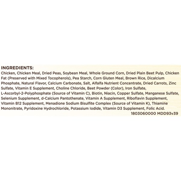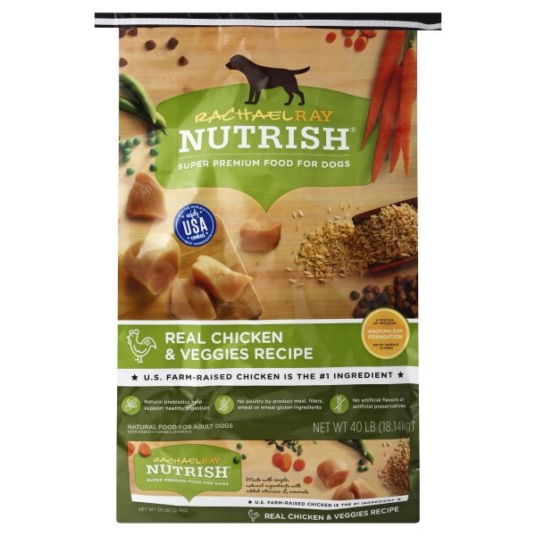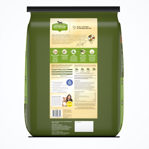 Details Ingredients Chicken, Chicken Meal, Dried Peas, Soybean Meal, Whole Ground Corn, Dried Plain Beet Pulp, Chicken Fat (Preserved with Mixed Tocopherols), Pea Starch, Corn Gluten Meal, Brown Rice, Dicalcium Phosphate, Natural Flavor, Calcium Carbonate, Salt, Alfalfa Nutrient Concentrate, Dried Carrots, Zinc Sulfate, Vitamin E Supplement, Choline Chloride, Beet Powder (Color), Iron Sulfate, L-ascorbyl-2-polyphosphate (Source of Vitamin C), Biotin, Niacin, Copper Sulfate, Manganese Sulfate, Selenium Supplement, D-calcium Pantothenate, Vitamin A Supplement, Riboflavin Supplement, Vitamin B12 Supplement, Menadione Sodium Bisulfite Complex (Source of Vitamin K), Thiamine Mononitrate, Pyridoxine Hydrochloride, Potassium Iodide, Vitamin D3 Supplement, Folic Acid. Show more Product features Rachael Ray Nutrish Real Chicken & Veggies Recipe is made with simple, natural ingredients, like real U.S. farm-raised chicken, which is always the number one ingredient, combined with wholesome vegetables and added vitamins & minerals. U.S. farm-raised chicken is the #1 ingredient No poultry by-product meal, filler, wheat, or wheat gluten ingredients Natural dog food with added vitamins & minerals Safely USA cooked with the world's best ingredients Special Features No By-Product Meals