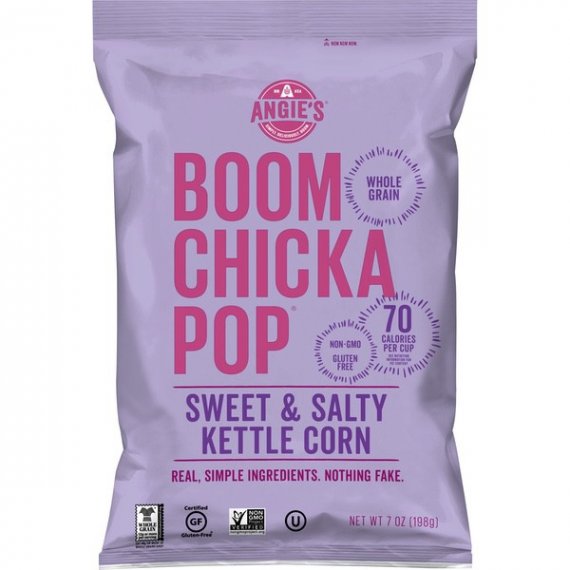 Details Ingredients Popcorn, Sunflower Oil, Cane Sugar, Sea Salt. Product features Like your favorite treat at the county fair, each bag of Angie's BOOMCHICKAPOP Sweet & Salty Kettle Corn Popcorn is packed with flavor. Enjoy this whole-grain, non-GMO popcorn as a vegan, gluten-free snack that's made with real, simple ingredients. This salty and sweet kettle corn has 70 calories per cup and 0 grams trans fat per serving. Each bag of popcorn has delicious, pre-popped kettle corn that's ready to eat right out of the bag. Keep this flavored popcorn on hand for road trips, office parties, after-school snacks, movie nights and other joyful snacking occasions. Order a bag of Angie's BOOMCHICKAPOP Popcorn for a pop of positivity anytime. Contains one 7-ounce bag of Angie's BOOMCHICKAPOP Sweet & Salty Kettle Corn Popcorn This Angie's BOOMCHICKAPOP Popcorn is made with real, simple ingredients, including real cane sugar and sea salt Grab a bag for an easy, salty-sweet snack that's pre-popped and ready to eat This kettle corn has 70 calories per cup of popcorn and 0 grams trans fat per serving Stock up on this vegan, gluten-free snack that's made with non-GMO, whole-grain popcorn Special Features
