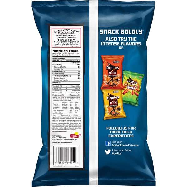 Details Ingredients Corn, Vegetable Oil (Corn, Canola, And/Or Sunflower Oil), Maltodextrin (Made From Corn), Salt, Tomato Powder, Corn Starch, Lactose, Whey, Skim Milk, Corn Syrup Solids, Onion Powder, Sugar, Garlic Powder, Monosodium Glutamate, Cheddar Cheese (Milk, Cheese Cultures, Salt, Enzymes), Dextrose, Malic Acid, Buttermilk, Natural and Artificial Flavors, Sodium Acetate, Artificial Color (Including Red 40, Blue 1, Yellow 5), Sodium Caseinate, Spice, Citric Acid, Disodium Inosinate, and Disodium Guanylate. Show more Product features Doritos tortilla chips with classic cool ranch flavor Crunchy straight from the bag or after scooping up dip or salsa These much loved treats are fun to enjoy at lunch, as an after-school snack, or party refreshment The Doritos brand is all about boldness. If you're up to the challenge, grab a bag of Doritos tortilla chips and get ready to make some memories you won't soon forget. It's a bold experience in snacking and beyond.