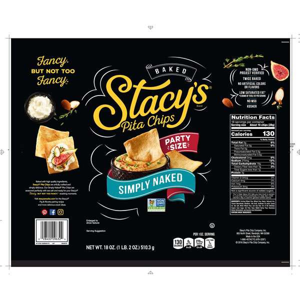 Details Ingredients Enriched Wheat Flour (Wheat Flour, Niacin, Reduced Iron, Thiamin Mononitrate, Riboflavin, Folic Acid), Sunflower Oil and/or Canola Oil, Sea Salt, Whole Wheat Flour, and Less Than 2% of the Following: Organic Cane Sugar, Oat Fiber, Yeast, Malted Barley Flour, Rosemary Extract (Antioxidant), and Ascorbic Acid (Antioxidant). Show more Product features We bake real pita from our own special recipe, slice it into chips, then bake it again for a delicious crunch. We think time is an essential ingredient, which is why we devote up to 14 hours to bake each batch of Stacy's Pita Chips. Stacy's Pita Chips Nothing But Sea Salt Party Size.serving:130 Calories.0.5g sat fat, 3% DV.270mg sodium, 11% DV.Less than 1g sugars.Non GMO project verified.nongmoproject.org.Sometimes it's better to go naked.Dressed in nothing but sea salt, these delicious baked chips are artfully simple with an incredible crunch.Enjoy them straight from the bag, with your favorite dip, or paired with a wedge of cheese and a glass of wine.When Stacy started making pita chips at her sandwich cart in Boston, she knew passion, hard work, and using only high quality, carefully selected ingredients were what her customers deserved.Those are still our values and what it takes to make the best snacks.It's the harder way, but it's the better way.That's the Stacy's Way™ and we're not messing with it.We bake real pita bread from our own special recipe, slice it into chips, then bake it again for a delicious, crunch.We think time is an essential ingredient, which is why we devote up to 14 hours to bake each batch of Stacy's® pita chips.That's just how long it takes to reach perfection.Try all of our delicious snacks:Stacy's® pita chips.Stacy's® pita crisps.Stacy's bagel chips.Stacy's pretzel chips.Non-GMO project verified.Baked.No artificial colors or flavors.Low saturated fat*.No MSG.*5 grams of total fat per serving.1-866-4STACYS (478-2297).stacyssnacks.com.©2013 Stacy's Pita Chip Company, Inc.
