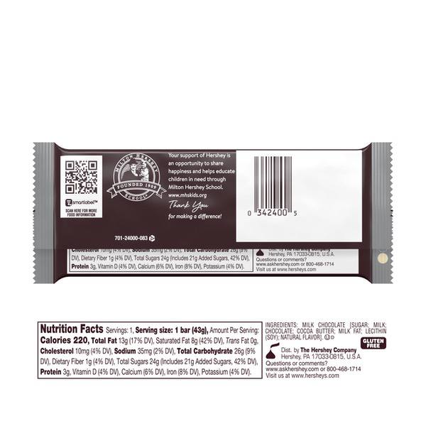 Details Ingredients Milk Chocolate [Cane Sugar, Milk, Chocolate, Cocoa Butter, Milk Fat, Lecithin (Soy), Natural Flavor]. Product features Reach for a classic treat with Hershey's Milk Chocolate. You can enjoy it as is or use it to make s'mores or other desserts. This Hershey's bar is made from rich milk chocolate. It's free of gluten so people with dietary restrictions can enjoy it safely. The design allows you to break it into pieces for sharing or for enjoying a little bit now and saving the rest for later. HERSHEY'S Milk Chocolate Bar, 1.55 Ounces: Perfect for snacking and s’mores making Milk chocolate Great for making personalized party favors Gluten-free and kosher chocolate candy Net Quantity of Content 1 X 1 Bar (43g)