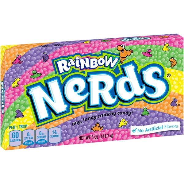 Details Ingredients Dextrose, Sugar, Malic Acid, and Less than 2% of Corn Syrup, Natural Flavors, Carnauba Wax, Carmine Color, Color Added, Blue 1, Blue 1 Lake, Blue 2 Lake, Red 40 Lake, Yellow 5, Yellow 5 Lake, Yellow 6. Show more Product features Tiny, tangy, crunchy candy, NERDS are delicious little characters—small and peculiarly shaped yet lovably packed with taste. Rainbow NERDS unleashes a colorful ensemble of fruit-inspired bites of joy, letting candy lovers pour out petite pieces of pure delight. Rainbow NERDS provide a delicious assortment of fruity flavors in a wide variety of vibrant colors.Enjoy some sweet satisfaction with NERDS—the tiny, tangy crunchy candy that is as unique as you are!Classic Concession/Video box is great for movie night!No artificial flavors Net Quantity of Content 9 X 1 Tbsp. (15g)