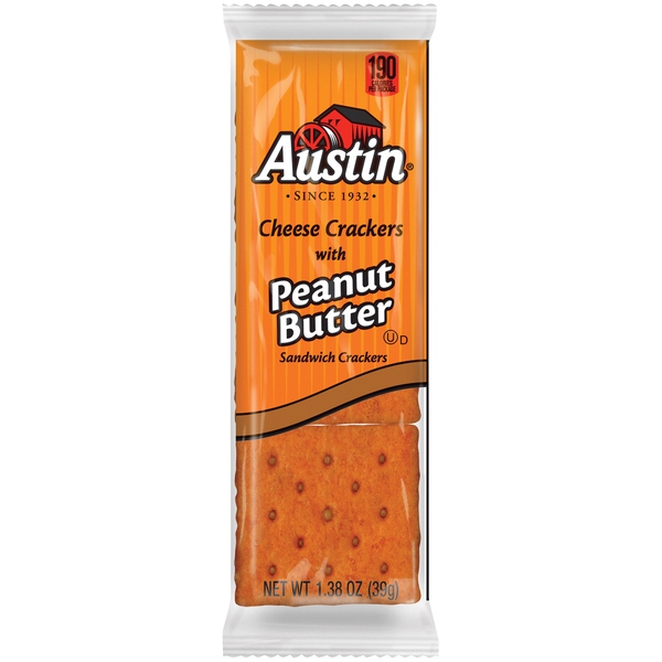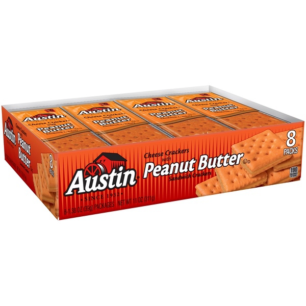 Details Ingredients ENRICHED FLOUR WHEAT FLOUR, NIACIN, REDUCED IRON, THIAMIN MONONITRATE [VITAMIN B1], RIBOFLAVIN [VITAMIN B2], FOLIC ACID), PEANUT BUTTER (ROASTED PEANUTS), SOYBEAN OIL WITH TBHQ FOR FRESHNESS, SUGAR, DEXTROSE, SALT, CONTAINS TWO PERCENT OR LESS OF LEAVENING (BAKING SODA, SODIUM ACID PYROPHOSPHATE,MONOCALCIUM PHOSPHATE), CHEDDAR CHEESE (MILK, CHEESE CULTURES, SALT, ENZYMES), YELLOW #6, CORNSTARCH, WHEY, RED PEPPER, BUTTERMILK, DISODIUM PHOSPHATE, SOY LECITHIN. Show more Product features The Austin Story: Austin's tradition of excellence and quality has been passed along for more than three generations. From our simple beginning to becoming one of the largest snack cracker makers in the country, our commitment to using only quality ingredients has remained constant. We start with rich, flavorful fillings, like smooth peanut butter or real cheese and layer them between two of our hearty, delicious snack crackers. It adds up to the perfect snack, good any time and any place. Enjoy the tasty tradition of Austin snacks. Austin Cheese Snack Crackers with Peanut ButterTaste freshnessChocolatey Peanut Butter Snack Cracker SandwichesHearty, delicious snack crackersKosherThis 8 Pack lets you enjoy tasty snacks anytimeMade with quality ingredientsAustin is one of the largest cracker makers in the U.S. and has been in the business for over three generationsKeep a supply at work for break timeSince 1932Great for snack, snackingPerfect On The GoAustin Cheese Snack Crackers with Peanut ButterTaste freshnessChocolatey Peanut Butter Snack Cracker SandwichesHearty, delicious snack crackersKosherThis 8 Pack lets you enjoy tasty snacks anytimeMade with quality ingredientsAustin is one of the largest cracker makers in the U.S. and has been in the business for over three generationsKeep a supply at work for break timeSince 1932Great for snack, snackingPerfect On The Go Net Quantity of Content 8 X 39 g