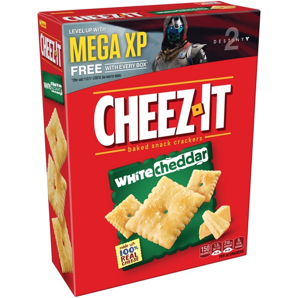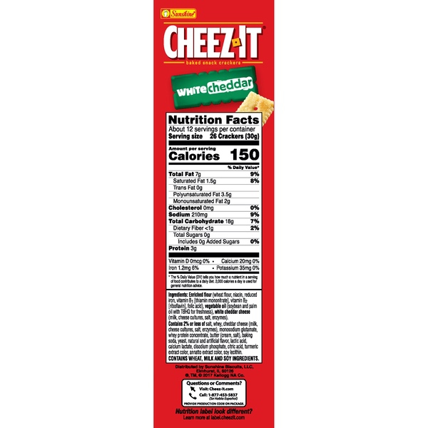 Details Ingredients ENRICHED FLOUR (WHEAT FLOUR, NIACIN, REDUCED IRON, VITAMIN B1 [THIAMIN MONONITRATE], VITAMIN B2 [RIBOFLAVIN], FOLIC ACID), VEGETABLE OIL (SOYBEAN AND PALM OIL WITH TBHQ FOR FRESHNESS), WHITE CHEDDAR CHEESE (MILK, CHEESE CULTURES, SALT, ENZYMES). CONTAINS 2% OR LESS OF SALT, WHEY, CHEDDAR CHEESE (MILK, CHEESE CULTURES, SALT, ENZYMES), MONOSODIUM GLUTAMATE, WHEY PROTEIN CONCENTRATE, BUTTER (CREAM, SALT), BAKING SODA, YEAST, NATURAL AND ARTIFICIAL FLAVOR, LACTIC ACID, CALCIUM LACTATE, DISODIUM PHOSPHATE, CITRIC ACID, TURMERIC EXTRACT COLOR, ANNATTO EXTRACT COLOR, SOY LECITHIN. Show more Product features Grab a box of Cheez-It White Cheddar Baked Snack Crackers and satisfy your crunchy craving with the taste of creamy white cheddar in every perfectly toasted bite.In 1906, W.K. Kellogg founded the Kellogg Company in Battle Creek, Michigan. Kellogg was strongly dedicated to nutrition, health and value and for more than 100 years, his commitment to excellence has guided the company. As the first company to fortify its cereals and create boxes that offer prizes, coupons and games, Kellogg has historically been a leader in industry, innovation and marketing. Today, as a top producer of cereal and convenience foods, Kellogg is a company that you can always rely on for high quality and great taste. Light and crispy bite-sized snack crackers made with the flavor of white cheddar cheese and a dusting of saltOur cheesy baked crackers are packed for convenience and make a delicious anytime snackMade with 100% real cheese aged for a bold taste; A classic, family-favorite snack that’s perfect for kids and adultsA travel-ready food; Makes a tasty bite at home or on the go; Ideal for gatherings, parties, snack spreads, and more; Stow in lunchboxes, totes, and backpacksIncludes 1, 12.4-ounce box of ready-to-eat snack crackers; Packaged for freshness and great taste Net Quantity of Content ABOUT 12 X 30 g