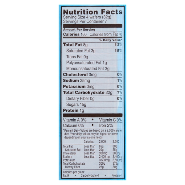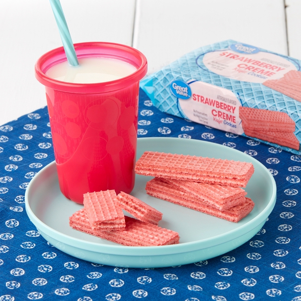 Details Ingredients Sugar, Enriched Flour (Wheat Flour, Malted Barley Flour, Niacin, Reduced Iron, Thiamine Mononitrate, Riboflavin, Folic Acid), Palm Oil, Dextrose, Canola Oil, Contains 2% or less of Soy Lecithin, Natural and Artificial Flavor, Salt, Baking Soda, Red 40, Red 3, Yellow 6, Blue 2, Red 40 Lake Show more Product features Summer's bounty comes in cookie form with Great Value Strawberry Creme Wafer Cookies. These pretty pink cookies sandwich sweet, fruity strawberry creme between delicate wafer cookies. With their cheery color and waffle-textured wafers, they add visual interest to dessert selections. Kids will enjoy taking apart the layers, and adults will appreciate the sophisticated flavor. They're the perfect light pairing with tea and coffee, and are free of artificial preservatives, high-fructose corn syrup, and trans fat. Make dessert time something special with Great Value Strawberry Creme Wafer Cookies. Great Value products provide families with affordable, high quality grocery and household consumable options. With our wide range of product categories spanning grocery and household consumables, we offer you a variety of products for your family's needs. Our products are conveniently available online and in Walmart stores nationwide, allowing you to stock up and save money at the same time. No preservatives No high fructose corn syrup No trans fat Kosher 8oz package contains 7 servings Net Quantity of Content 7 X 4 wafers (32g)