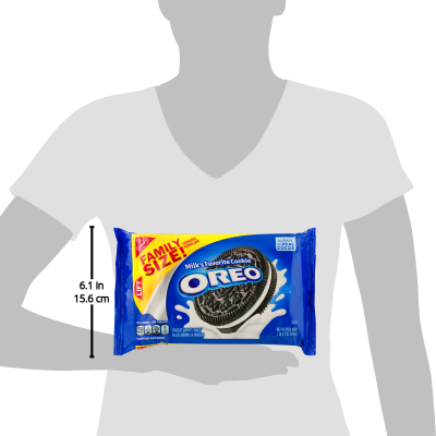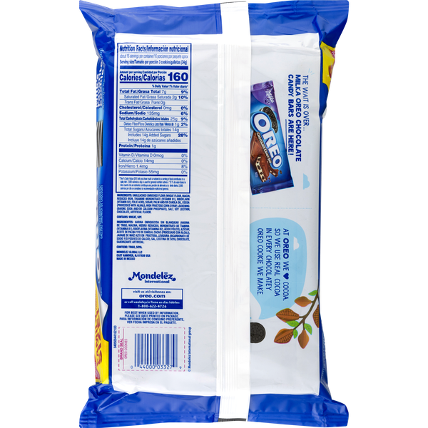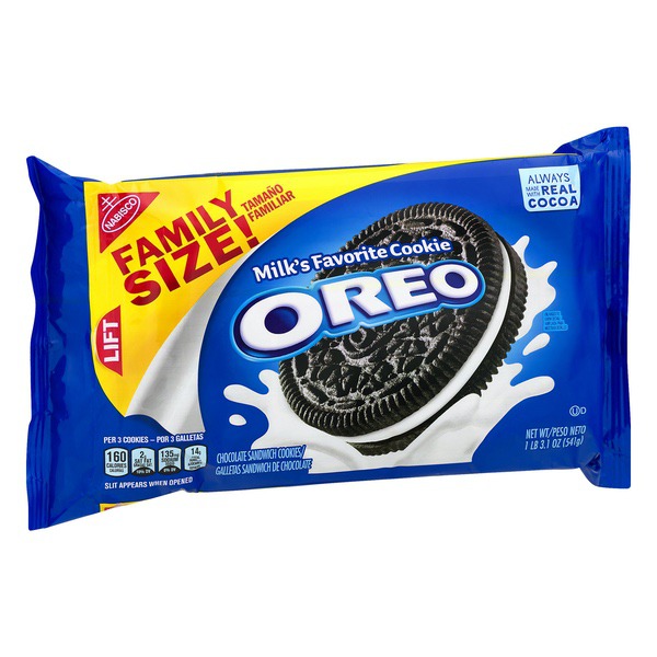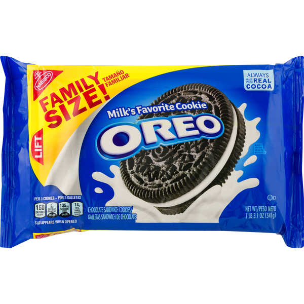 Details Ingredients Unbleached Enriched Flour (Wheat Flour, Niacin, Reduced Iron, Thiamine Mononitrate {Vitamin B1}, Riboflavin {Vitamin B2}, Folic Acid), Sugar, Palm And/Or Canola Oil, Cocoa (Processed With Alkali), High Fructose Corn Syrup, Leavening (Baking Soda And/Or Calcium Phosphate), Salt, Soy Lecithin, Chocolate, Artificial Flavor. Show more Product features Oreo Cookies are a classic snack that adults and children alike can enjoy alone or with a glass of milk. Dip and dunk them whole or twist them apart to savor the filling before munching on the chocolatey wafers. They can be fun to eat while watching a movie, as an after-school snack or just about anytime you want to satisfy a sweet tooth. When packing a lunch, include a few Oreos as a quick dessert to surprise your loved ones or to indulge in yourself. These Oreo chocolate sandwich cookies are packaged in a resealable bag to lock in freshness and maintain their crunchy texture. Try additional varieties of Oreo sandwich cookies, including Golden, Lemon Creme, Jelly Donut and Chocolate Thins as well as a selection of mini cookies in munch-pack sizes (each sold separately). Oreo Cookies, Family Size, 19.1 oz:Sandwich cookies made of crisp wafers stuffed with creme fillingEasy-open pull tabKosher dairy is used in the production of these chocolate wafer cookiesA favorite snack for adults and kids alikeFamily-size pack is an economical choice Oreo chocolate sandwich cookies come in a 19.1 oz resealable bag to maintain the product's freshnessEnjoy after meals as a sweet dessert treat Net Quantity of Content 16.0 X 3 cookies (34g)