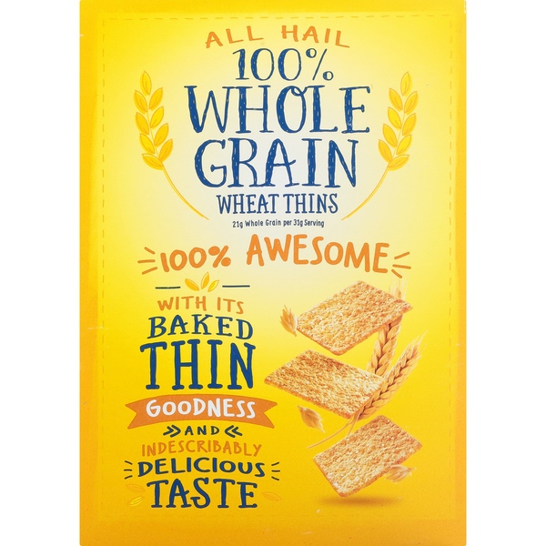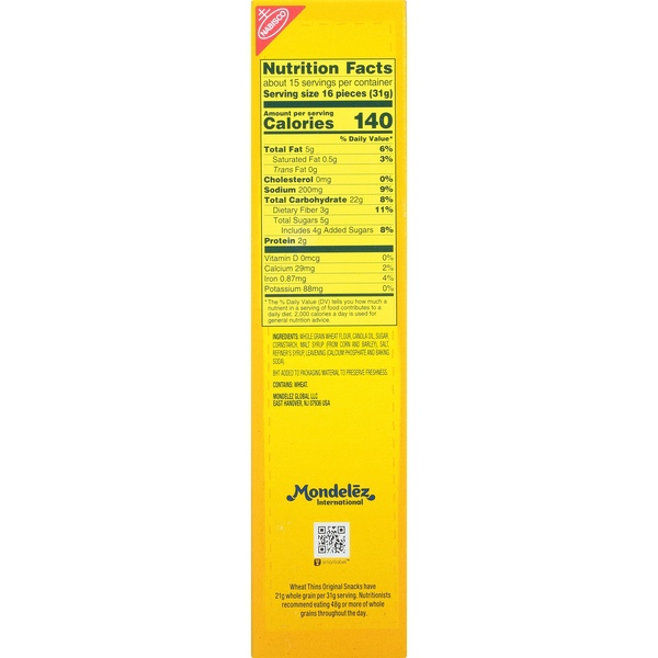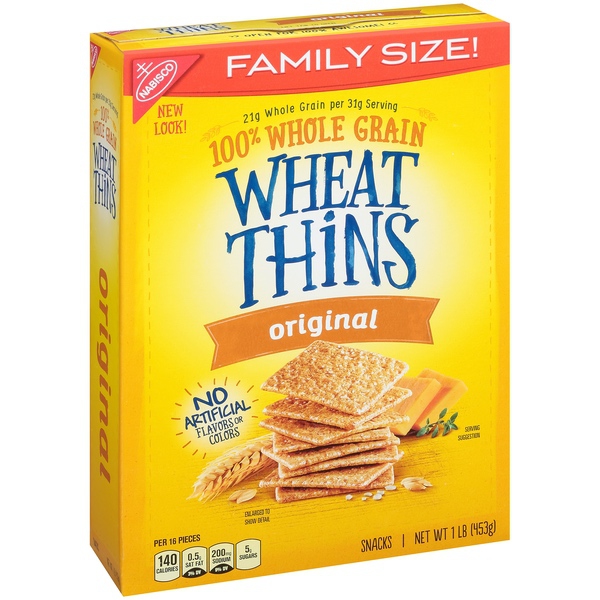 Details Ingredients INGREDIENTS: WHOLE GRAIN WHEAT FLOUR, CANOLA OIL, SUGAR, CORNSTARCH, MALT SYRUP (FROM CORN AND BARLEY), SALT, REFINER'S SYRUP, LEAVENING (CALCIUM PHOSPHATE AND BAKING SODA). BHT ADDED TO PACKAGING MATERIAL TO PRESERVE FRESHNESS. Show more Product features Discover the delicious 100% whole grain crunch of toasted Wheat Thins snacks. Wheat Thins are toasted instead of fried and contain no cholesterol or high-fructose corn syrup, making them a smart snack choice for any occasion. These delicious crackers pair perfectly with cheese, fruit, spreads, and more--but are great all on their own. Each box is sealed to lock in freshness and great taste for gatherings, parties, or simply snacking around the house. Discover the delicious 100% whole grain crunch of toasted Wheat Thins snacks.Wheat Thins are toasted instead of fried and contain no cholesterol or high-fructose corn syrup, making them a smart snack choice for any occasion.These delicious crackers pair perfectly with cheese, fruit, spreads, and more--but are great all on their own.Each box is sealed to lock in freshness and great taste for gatherings, parties, or simply snacking around the house.This includes 16oz box of Wheat Thins Original Crackers Family Size Special Features Family size Net Quantity of Content 15 X 31 g
