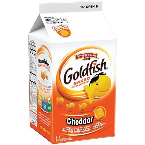 Details Ingredients Made With Smiles And Enriched Wheat Flour (Flour, Niacin, Reduced Iron, Thiamine Mononitrate, Riboflavin, Folic Acid), Cheddar Cheese ([Cultured Milk, Salt, Enzymes], Annatto), Canola And/Or Sunflower Oils, Contains 2 Percent Or Less Of: Salt, Yeast, Sugar, Autolyzed Yeast, Baking Soda, Monocalcium Phosphate, Paprika, Spices, Celery, Onion Powder. Contains: Wheat, Milk. Show more Product features The Snack that Smiles Back: When it comes to Goldfish crackers, you can feel good about serving your favorite snacks. All of our cheese varieties, like cheddar, are baked with real cheese, and Goldfish crackers are made with no artificial preservatives or flavors. The 30 oz. carton is also available in Xtra Cheddar Flavor Blasted Goldfish crackers, Cheddar Goldfish Colors, and Baked with Whole Grain Cheddar Goldfish crackers - made with 12g of whole grain per serving. Everyone loves Goldfish crackers - they're tasty and fun! With a large 30 oz. carton you can always come back for more, or have enough to feed a crowd. Playful crackers baked with a smile Cheddar flavor Baked with real cheese 30 oz. carton No artificial preservatives or flavors Net Quantity of Content 28.0 X 55 Pieces (30g/1.1 oz)
