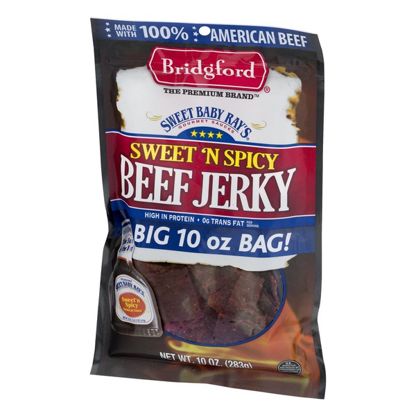 Details Ingredients Beef, Water, Seasoning Blend (Salt, Brown Sugar, Sugar, Mustard, Monosodium Glutamate, Dehydrated Garlic, Red Pepper, Sodium Erythorbate, Onion Powder, Spice Extractive), Brown Sugar, Sweet Baby Ray's Jerky Base (Vinegar Powder, [Dextrin, Modified Food Starch, Vinegar Solids], Tomato Powder, Pineapple Juice Powder, [Maltodextrin, Pineapple Juice], Worcestershire Sauce Powder [{Distilled Vinegar, Molasses, Corn Syrup, Salt, Caramel Color, Garlic Powder, Sugar, Spices, Tamarind, Natural Flavor and Sulfating Agents}, Maltodextrin], Natural Smoke Flavor, Spices and Not More than 2% Silicon Dioxide Added to Prevent Caking), Red Pepper, Sodium Nitrite. Show more Product features Delicious and tender beef jerky! Bridgford's Sweet Baby Ray's Sweet 'n' Spicy beef jerky is a flavorful and tender jerky. This beef jerky is made in Chicago, IL with 100% American Beef. Be sure to check out the other great flavors! Bridgford Sweet Baby Ray's Sweet 'n Spicy Beef Jerky,:Based on the flavorful, award-winning Sweet Baby Ray's barbecue sauce! Made from 100% American Beef! A full 10oz per package! High in Protein! 0g trans-fat per serving. Resealable bag. Net Quantity of Content 10 X 1 ounce
