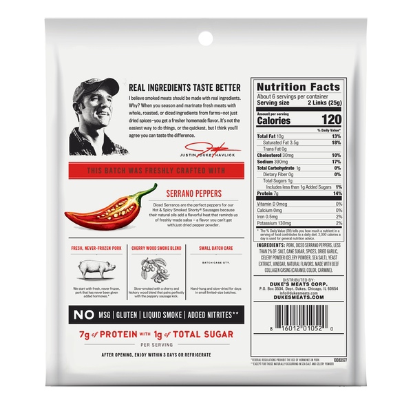 Details Ingredients Pork, Serrano Peppers, Less than 2% of: Salt, Cane Sugar, Spices, Vinegar, Celery Powder (Celery Powder, Sea Salt), Dried Garlic, Yeast Extract, Natural Flavors. Made with Beef Collagen Casing (Caramel Color, Carmine). Show more Product features Short on size, not on flavor, Duke's Hot & Spicy Smoked Shorty Sausages are made from the best ingredients we could get our hands on and slow-smoked to be pint-sized perfections. Diced red and green serranos lend natural oils that add a flavorful heat reminiscent of freshly made salsa: It's a flavor you can’t get with just dried pepper powder. Made with fresh, never frozen pork, these delicious gluten-free meat snacks contain 7 g protein and 1 g sugar per serving. Contains a 5-ounce bag of Duke's Hot & Spicy Smoked Shorty Sausages Hot and spicy sausages made with fresh-diced red and green serranos for a delightfully flavorful heat Made with fresh, never frozen pork for a gluten-free meat snack Slow-smoked with a cherry and hickory wood blend; pairs perfectly with the peppery sausage kick Smoked sausage snack with 7 g protein and 1 g sugar per serving Special Features No Net Quantity of Content 6.0 X 25g