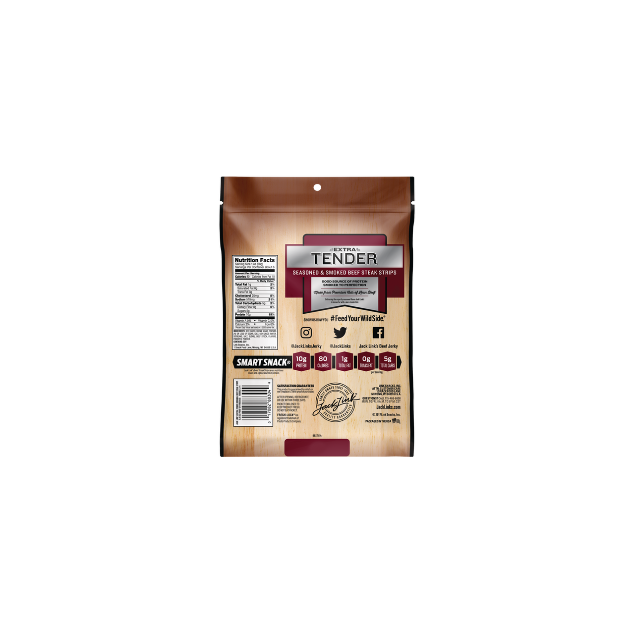 Details Ingredients Beef, Water, Brown Sugar, Contains 2% Or Less Of Sugar, Salt, Soy Sauce (Water, Soybeans, Salt, Sugar), Beef Stock, Flavors, Pineapple Powder. Product features Looking for a soft beef tender bite thats full of flavor? Jack Links is shaking up the protein snack landscape again by introducing Jack Links Extra Tender Beef Jerky. Think of the best smoked meat youve ever had. Now forget about it, because these extra tender, savory, smoky steak strips are better than that imaginary meat. Original Flavored Beef JerkyContains 1 bag of 5.85oz extra tender stripsMeets USDA Smart Snack nutrition standards for schoolsHigh in protein, low in fat and carb smartClean label snack with no added MSG or perservatives Net Quantity of Content 1 Count Of 5.85oz Jerky X 28.00 g