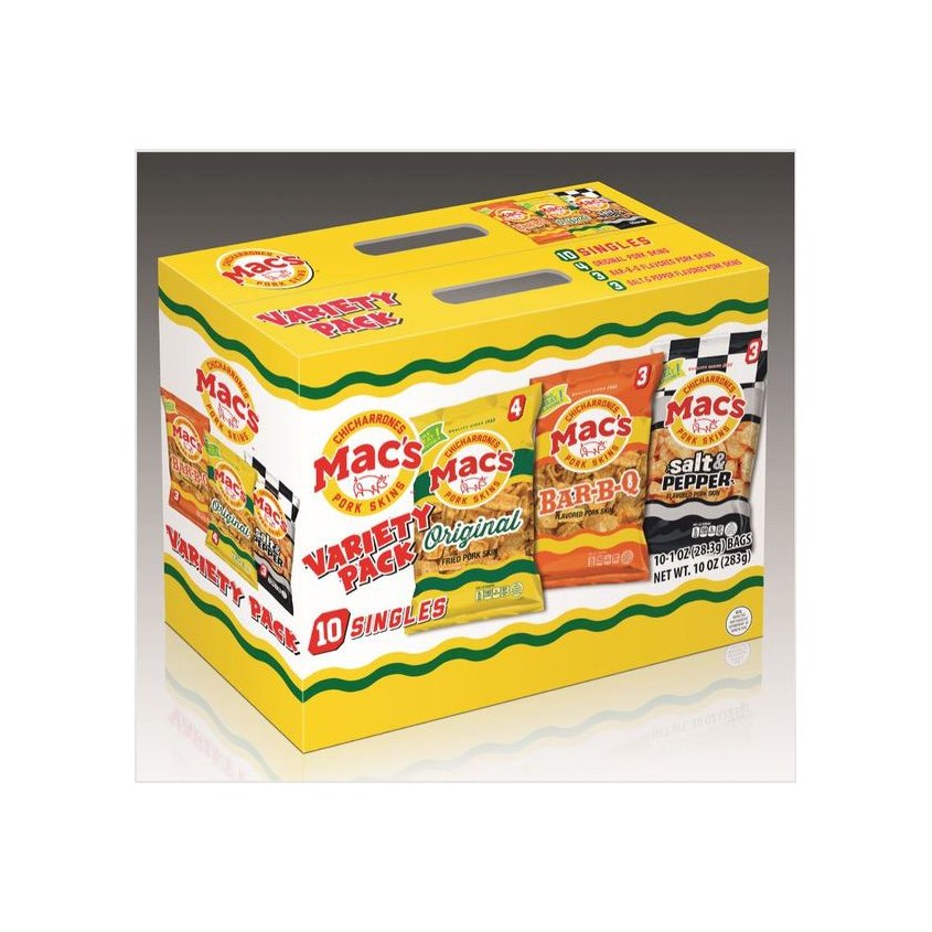 Details Product features Mac's Pork Skins Variety Pack 10/1oz -- Contains 4 Original Pork Skins, 3 BBQ Pork Skins, and 3 Salt & Pepper Pork Skins! Mac's Pork Skins Variety Pack 10/1oz -- Contains 4 Original Pork Skins, 3 BBQ Pork Skins, and 3 Salt & Pepper Pork Skins!