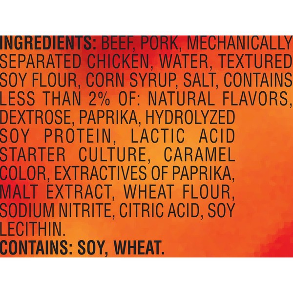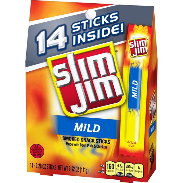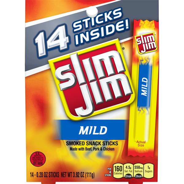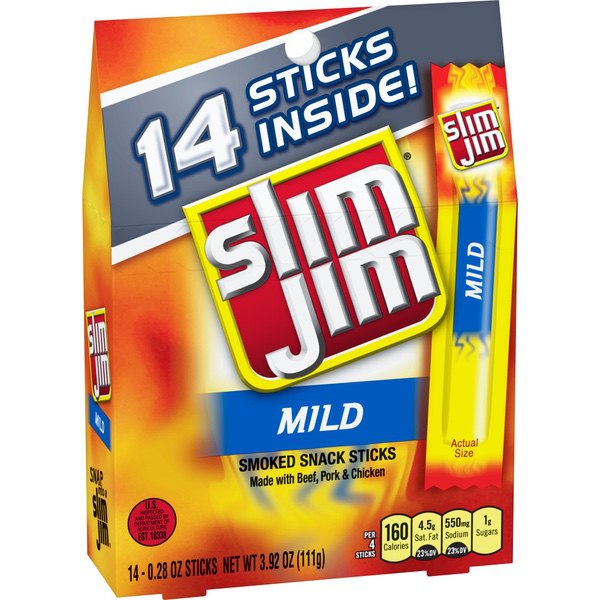 Details Ingredients Beef, Pork, Mechanically Separated Chicken, Water, Textured Soy Flour, Corn Syrup, Salt, Contains less than 2% of: Natural Flavors, Dextrose, Paprika, Hydrolyzed Soy Protein, Lactic Acid Starter Culture, Caramel Color, Extractives of Paprika, Malt Extract, Wheat Flour, Sodium Nitrite, Citric Acid, Soy Lecithin. CONTAINS: SOY, WHEAT. Show more Product features Slim Jim is America’s #1 brand of meat stick. Individually wrapped Slim Jim Mild Flavored Smoked Snack Stick, perfect for snacking on the go. Each 4-meat-stick serving is loaded with 6 g protein and made with beef, pork, and chicken, because beefy appetites require an even beefier snack. Slim Jim offers a full line of beef sticks, snack sticks, and beef jerky. Get intense, smoky flavor with delicious Slim Jim Mild Flavored Smoked Snack Stick. Individually wrapped for a quick and easy meat snackSlim Jim meat sticks use spicy beef, pork, and chicken, because beefy appetites require an even beefier snackIndividually wrapped snack sticks for an easy, on-the-go meat feast that’ll kick hunger to the curbThe intensely bold Mild Flavor is prime for snack time, lunchtime, after school, or anytime—carry one on you in caseContains (14).28 oz Slim Jim Mild Flavored Smoked Snack Sticks0 g trans fat per serving Net Quantity of Content 3.5 X 32g