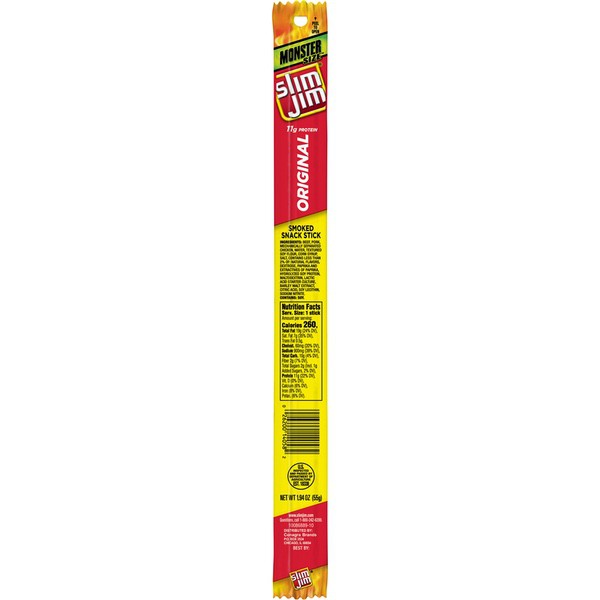 Details Ingredients Beef, Pork, Mechanically Separated Chicken, Water, Textured Soy Flour, Corn Syrup, Salt, Contains less than 2% of: Natural Flavors, Dextrose, Paprika and Extractives of Paprika, Hydrolyzed Soy Protein, Maltodextrin, Lactic Acid Starter Culture, Barley Malt Extract, Citric Acid, Soy Lecithin, Sodium Nitrite. CONTAINS: SOY. Show more Product features Slim Jim is America's #1 brand of meat stick. Individually wrapped Slim Jim Monster Original Flavored Smoked Snack Stick, perfect for snacking on the go. Each meat stick is loaded with 11 g protein and made with beef, pork, and chicken, because beefy appetites require an even beefier snack. Slim Jim offers a full line of beef sticks, snack sticks, and beef jerky. Get intense, smoky flavor with delicious Slim Jim Monster Original Flavored Smoked Snack Stick. Individually wrapped meat stick for a quick and easy snack Slim Jim meat sticks use spicy beef, pork, and chicken, because beefy appetites require an even beefier snack Each Monster-size snack stick contains 11 g protein Snap into the intense, smoky Original flavor in every snack stick 1.94 oz. Slim Jim Monster Original Flavored Smoked Snack Stick Net Quantity of Content 1.0 X 55g
