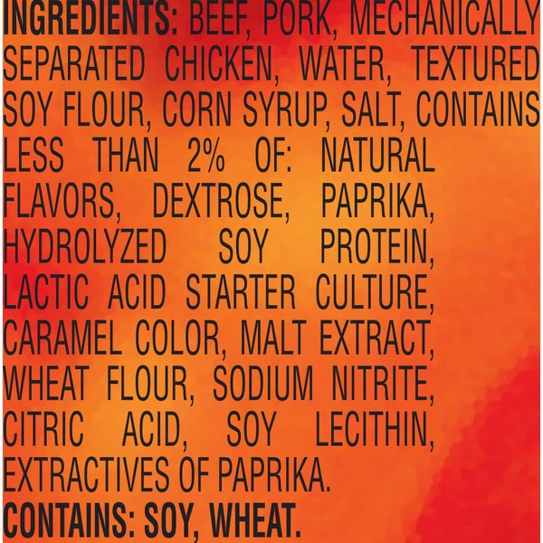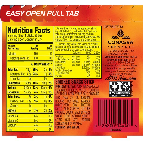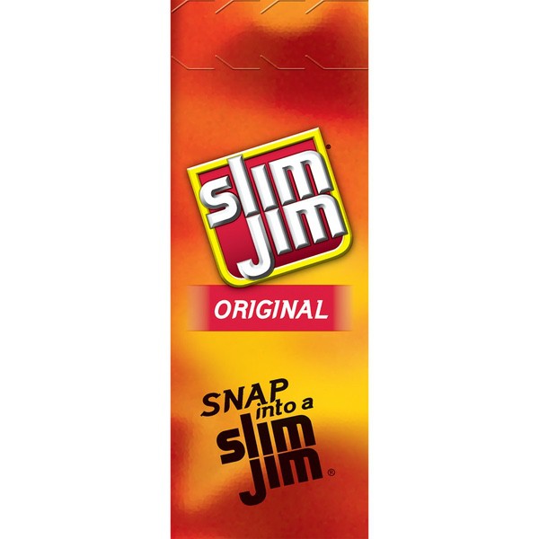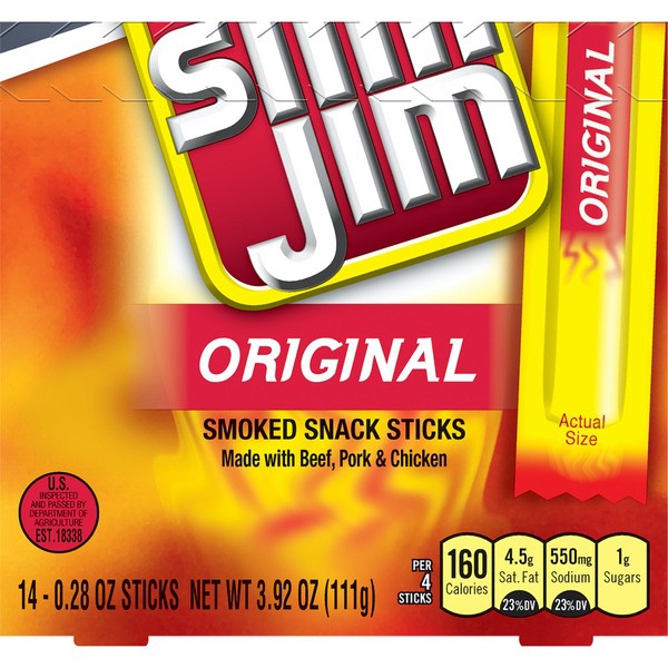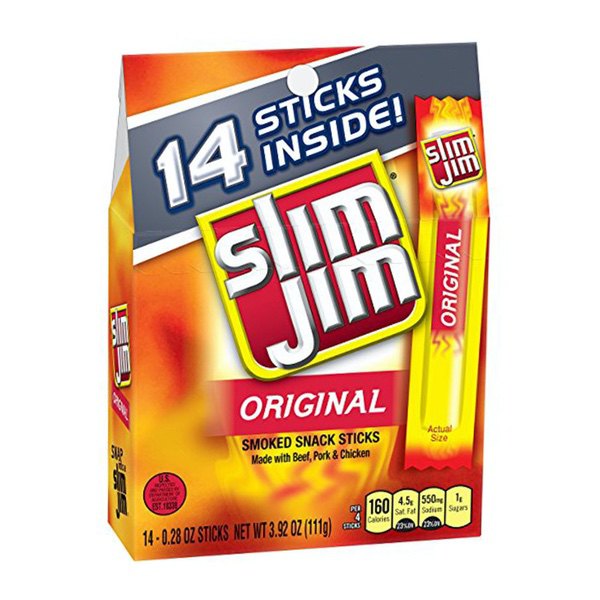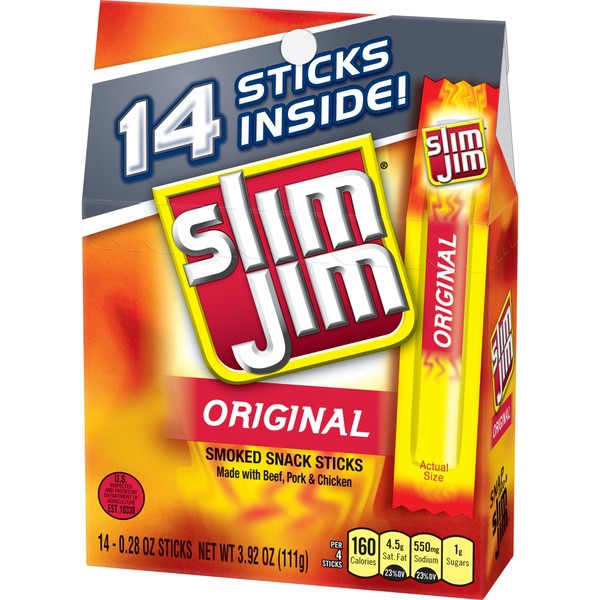 Details Ingredients Beef, Pork, Mechanically Separated Chicken, Water, Textured Soy Flour, Corn Syrup, Salt, Contains less than 2% of: Natural Flavors, Dextrose, Paprika and Extractives of Paprika, Hydrolyzed Soy Protein, Maltodextrin, Lactic Acid Starter Culture, Barley Malt Extract, Citric Acid, Soy Lecithin, Sodium Nitrite. CONTAINS: SOY. Show more Product features Slim Jim Original Snack-Sized Smoked Meat Stick is locked and loaded on-the-go snacks that fit into your day and stay fresh. This tasty jack-of-all-trades goes anywhere: Stow a pack in the car, under the bed, on the golf links, or even at tonight’s dinner party for your vegan, dairy, paleo-diet-loving-gluten- (and pretty much all flavor-) free aunt’s house and satisfy your hunger anytime, anywhere. Made with 6 grams of protein in each delectable serving, this meaty snack stick punches your taste buds in the face with their carnivore-pleasing recipe of bold flavors. But don’t stop there—try Slim Jim’s epic portable portfolio of meat sticks, snack sticks, and beef jerky, and forget all about how hungry that old ketogenic diet used to make you. Snap into a Slim Jim and snack like the beefy boss you know you are. Slim Jim Original Snack Stick is locked and loaded with an energy-maintaining, belly-filling 6 grams of protein in each servingEach meat stick is made to please your carnivorous cravings with a mouth-pleasing bold taste your taste buds craveIndividually wrapped snack stick for an easy, on-the-go meat feast that’ll kick hunger to the curbThe intensely bold Original Flavor is prime for snack time, lunchtime, after school, or anytime—carry one on you in caseContains 14 tasty, individually wrapped .28 oz. Slim Jim Original Flavored Smoked Snack Sticks0 g trans fat per serving Net Quantity of Content 3.5 X 32g