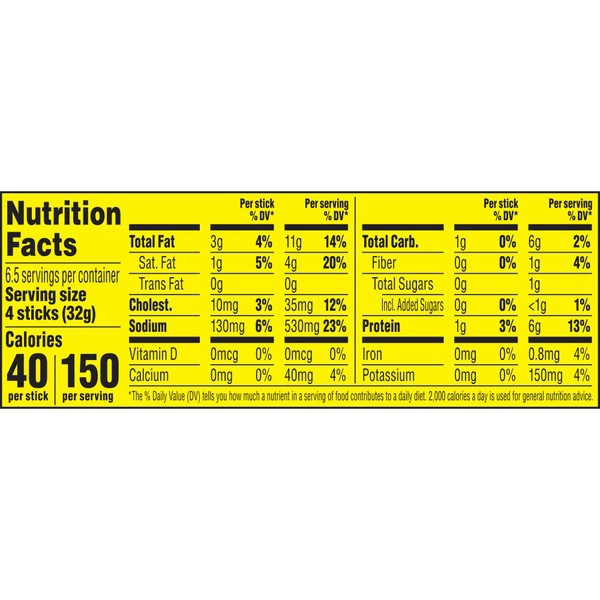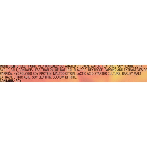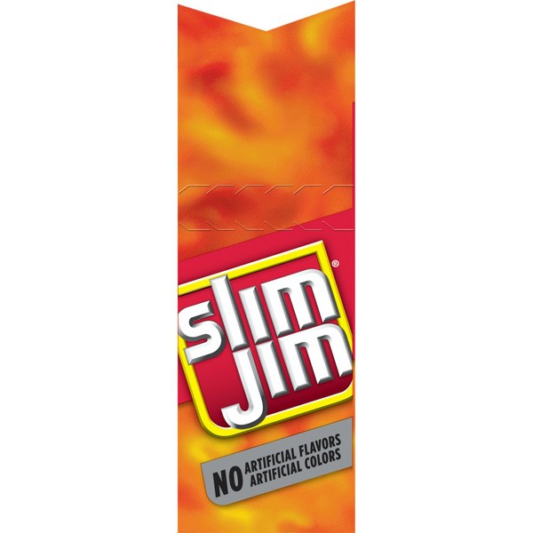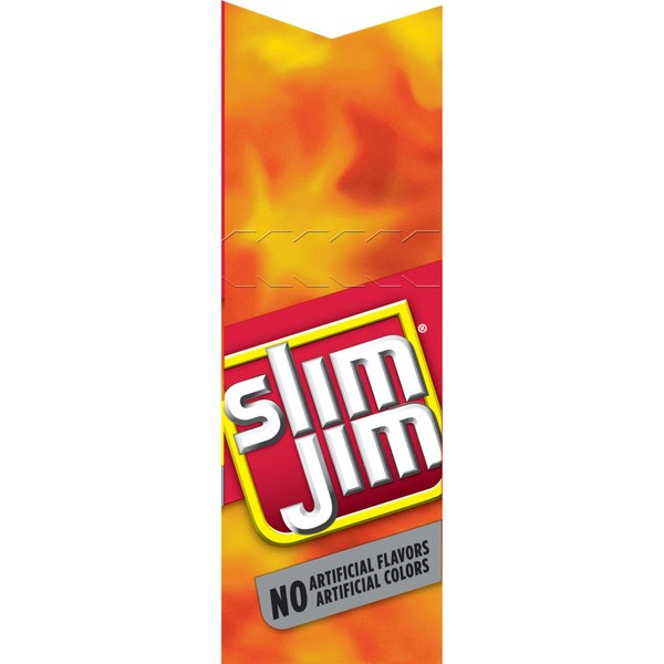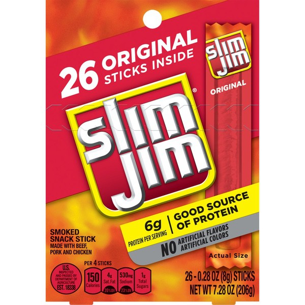 Details Ingredients Beef, Pork, Mechanically Separated Chicken, Water, Textured Soy Flour, Corn Syrup, Salt, Contains less than 2% of: Natural Flavors, Dextrose, Paprika and Extractives of Paprika, Hydrolyzed Soy Protein, Maltodextrin, Lactic Acid Starter Culture, Barley Malt Extract, Citric Acid, Soy Lecithin, Sodium Nitrite. CONTAINS: SOY. Show more Product features Slim Jim Original Snack-Sized Smoked Meat Stick is locked and loaded on-the-go snacks that fit into your day and stay fresh. This tasty jack-of-all-trades goes anywhere: Stow a pack in the car, under the bed, on the golf links, or even at tonight's dinner party for your vegan, dairy, paleo-diet-loving-gluten- (and pretty much all flavor-) free aunt's house and satisfy your hunger anytime, anywhere. Made with 6 grams of protein in each delectable serving, this meaty snack stick punches your taste buds in the face with their carnivore-pleasing recipe of bold flavors. But don't stop there-try Slim Jim's epic portable portfolio of meat sticks, snack sticks, and beef jerky, and forget all about how hungry that old ketogenic diet used to make you. Snap into a Slim Jim and snack like the beefy boss you know you are. Slim Jim Original Snack Stick are locked and loaded with an energy-maintaining, belly-filling 6 grams of protein in each servingEach meat stick is made to please your carnivorous cravings with a mouth-pleasing bold taste your taste buds craveIndividually wrapped snack sticks for an easy, on-the-go meat feast that'll kick hunger to the curbThe intensely bold Original Flavor is prime for snack time, lunchtime, after school, or anytime-carry one on you in caseContains 26 tasty, individually wrapped .28 oz. Slim Jim Original Flavored Smoked Snack Sticks0 g trans fat per serving Net Quantity of Content 1.0 X 8g