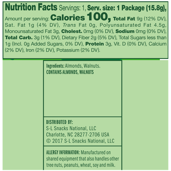 Details Ingredients Almonds, Walnuts. Product features Neither sweet nor salty, our buttery tasting walnuts complement our crunchy almonds. We add zero salt to this 100-calorie nut blend, a healthy and satisfying go-to snack. With no artificial preservatives, colors, or flavors; no gluten, and no GMOs, it's a snack you'll feel good about! Buttery tasting walnuts and crunchy almonds, no salt added! A delicious better for you snack on-the-go! Non-GMO Project Verified; Certified Gluten Free; no artificial preservatives, colors, or flavors 3g of protein in each pack to keep you going strong 10 individual snack packs of nuts in each box Pack of Net Quantity of Content 10 X 15.8 g