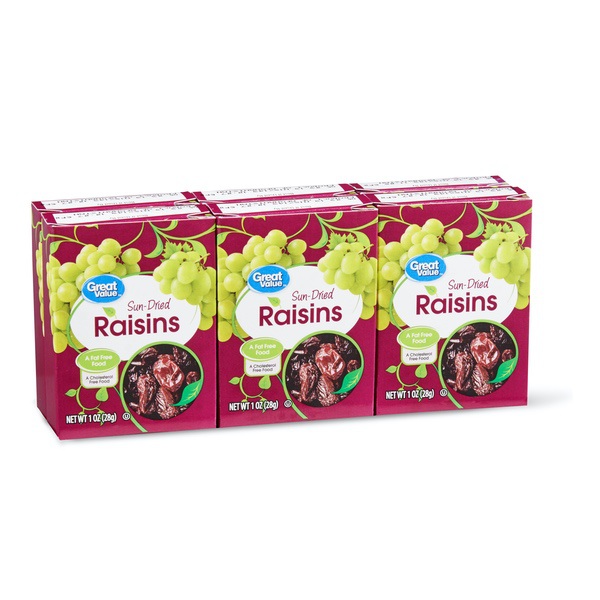 Details Ingredients Raisins Product features Great Value Sun-Dried Raisins offer you a healthy, delicious snack. These raisins make a great snack in-between meals, at the office, while studying at the library or a great addition to your lunch. You can also get creative and add them to salads, use them in homemade trail mix recipes or use them while baking. This pack of Great Value Sun-Dried raisins come with six, one oz. boxes making it easy to stock up for continued enjoyment. These raisins are gluten-free, fat free and cholesterol free so they're delicious and nutritious. Enjoy the sweet taste of Great Value Sun-Dried Raisins offer you a healthy, delicious snack.Great Value products provide families with affordable, high-quality grocery and household consumable options. With our wide range of product categories spanning grocery and household consumables, we offer you a variety of products for your family's needs. Our products are conveniently available online and in Walmart stores nationwide, allowing you to stock up and save money at the same time. Great Value Sun-Dried Raisins, 6 oz, 6 Count: Fat free Cholesterol Free Perfect to snack on Great addition to salads, homemade trail mixes, and baking recipes Gluten-free Great Value Sun-Dried Raisins, 6 oz, 6 Count:Fat freeCholesterol FreePerfect to snack onGreat addition to salads, homemade trail mixes, and baking recipesGluten-free Net Quantity of Content 1 X 1 box (28g)