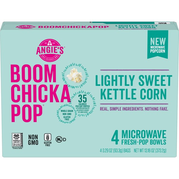 Details Ingredients Whole Grain Popcorn, Expeller Pressed Palm Oil, Cane Sugar, Sea Salt, Monk Fruit Extract. Product features Imagine you're at the state fair and dig in to Angie's BoomChickaPop Lightly Sweet Kettle Corn Microwave Popcorn. With real, simple ingredients (nothing fake!), 35 calories per cup popped, and 0 g trans fat per serving, you can enjoy the delicious hint of sweet flavor without any guilt. Plus, it's whole grain, non-GMO, and gluten free. Just pop our fresh-pop bowl in the microwave, then open right up for a convenient snack that's ready for you to grab right out of the bowl. Midday munchies and movie nights will never be the same. Now, get out there and crush it. (4) 3.29 oz. fresh-pop bowls of Angie's BoomChickaPop Lightly Sweet Kettle Corn Microwave PopcornEnjoy the perfect hint of sweet with Angie's BoomChickaPop Lightly Sweet Kettle Corn Microwave PopcornPops up in the microwave in a convenient fresh-pop bowl, so your snack is easy to grab and enjoy without any extra dishes35 calories per cup popped and 0 g trans fat per serving for a snack without all the guiltWhole grain, non-GMO, and gluten freeThe perfect snack for movie night, for curing the midday munchies, or for any timeYou can feel good about enjoying this popcorn—or about sharing it with your family Net Quantity of Content 11.0 X 35g